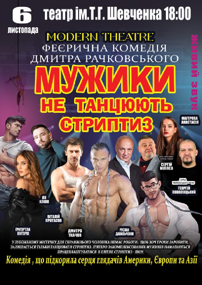 Сидячи в залі для глядачів, ми сміємося і щиро переживаємо за наших героїв, і з кожною хвилиною стаємо все ближче і ближче до розв'язки подій. Фінал цієї незвичайної історії - феєричне шоу, що несе заряд емоцій, загострення пристрастей і божевільну любов до неї, до жінки, а жінці дуже корисно вдосталь, до сліз, до кольок посміятися. Навіть, напевно, корисніше, ніж подивитися на голого мужика.