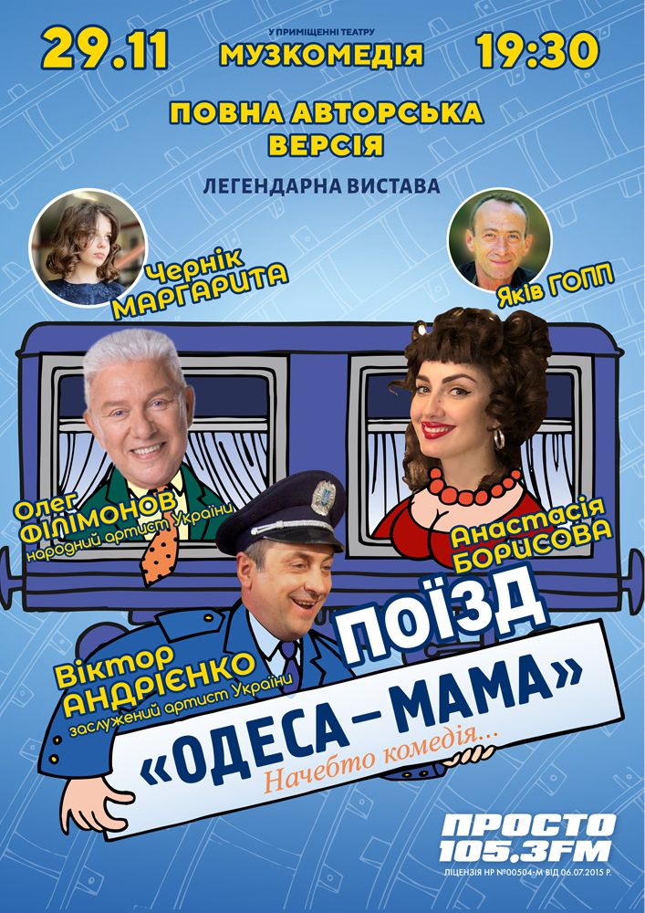 У Театрі музкомедії (ОАТМК ім. М. Водяного) відбудеться вистава «Поїзд «Одеса-мама» за участі легендарних акторів: Олега Філімонова і Віктора Андрієнка
