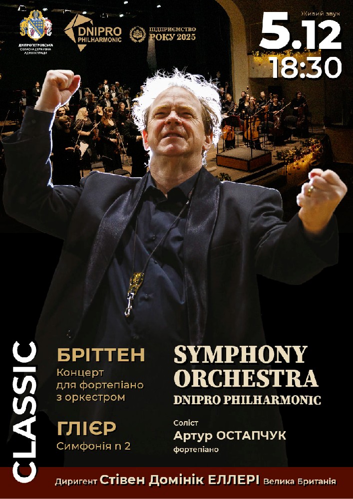 Стівен Домінік ЕЛЛЕРІ — британський диригент світового рівня, головний запрошений диригент Академічного симфонічного оркестру Дніпровської філармонії. Його діяльність охоплює практично всі континенти, а географія гастролей включає Велика Британію, Німеччину, Австрію, Швейцарію, Польщу, Японію, Литву, Мексику, Перу, Францію, Індію, Китай, В’єтнам, Австралію та Гану. Маестро виступав на найпрестижніших сценах світу — Берлінській філармонії, Мюнхенській філармонії, Лейпцизькому Гевандгаузі, Королівському Альберт-голі в Лондоні, де диригував великим концертом до 100-річчя незалежності Польщі.