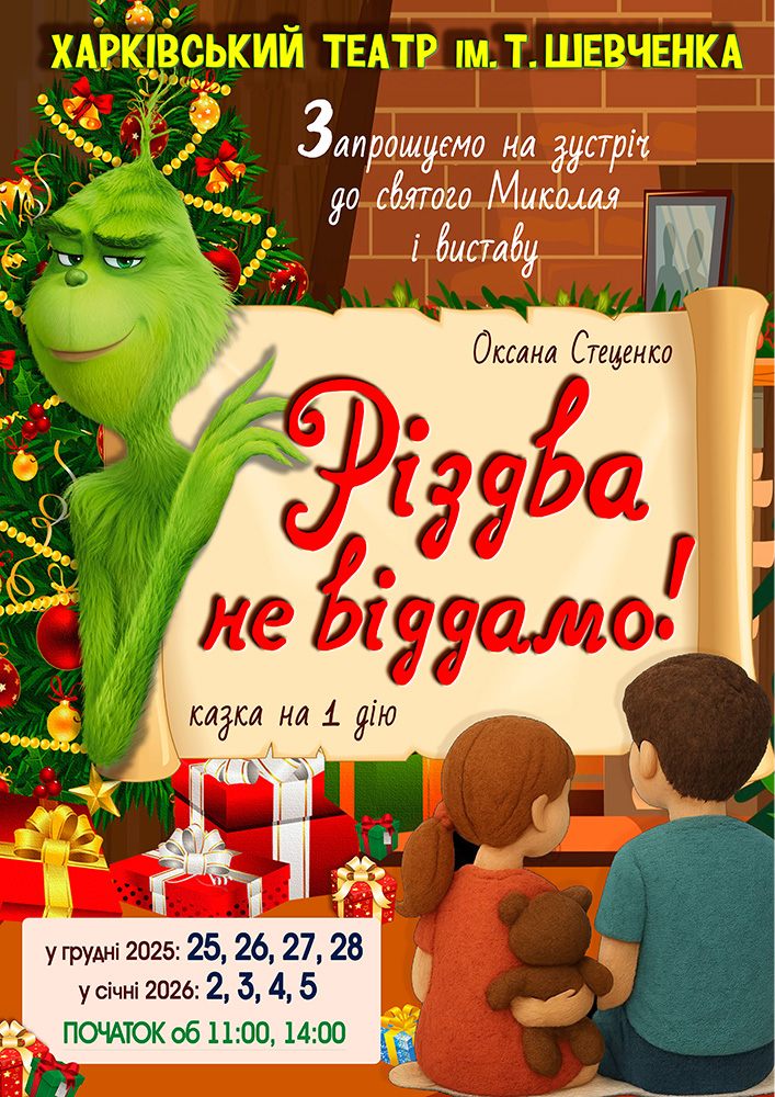 Наша весела й добра вистава запрошує дітей і дорослих у сучасну різдвяну казку з дрібкою харківського колориту. Тут лунають пісні й загадки, а ще оживає ялинка, під якою діти знаходять чарівні подарунки. Аж раптом з’являється пустотливий Грінч, який хоче вкрасти Різдво, проте доброта й щирість перемагають. Разом герої вчаться домовлятися, ділитися теплом і берегти дружбу.