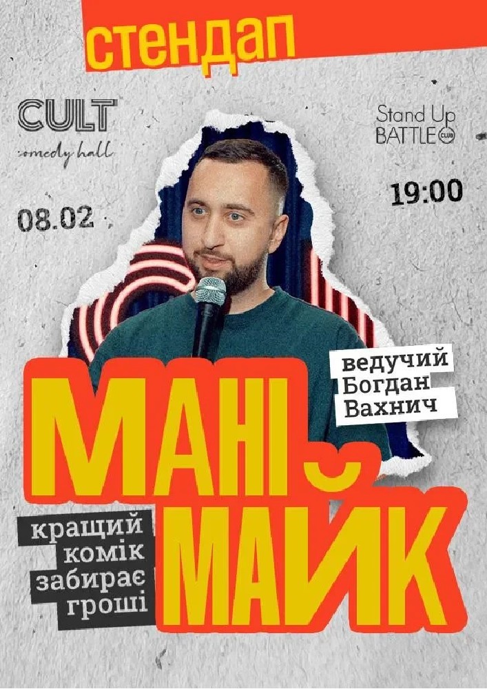 МАНІМАЙК - це коли досвідчені коміки змагаються своїми жартами за грошовий приз. Глядачі обирають найсмішнішого, тому весело буде всім - і глядачам, і самим комікам