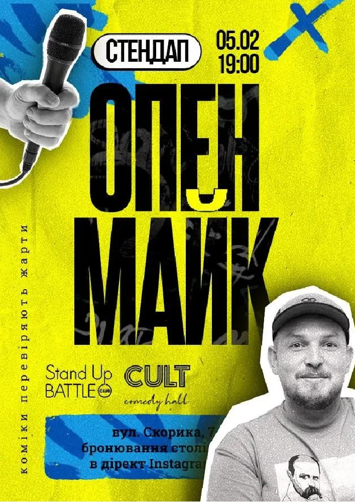 Це вечір, де коміки виходять на сцену зі своїми жартами та тестують матеріал. Він отримує перші реакції залу й формується для майбутніх виступів. На ОПЕНМАЙК може вийти кожен охочий - спробувати себе на сцені та показати свій стендап.