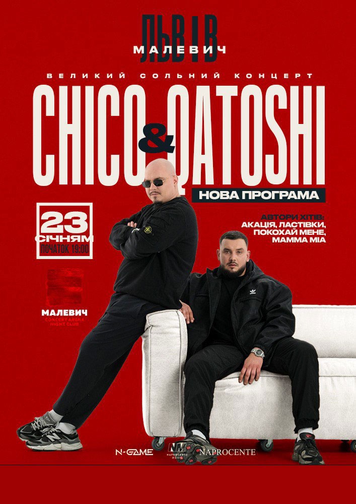 Вже зовсім скоро Chico & Qatoshi дають свій сольний концерт у вашом місті , де разом з вами заспівають улюблені хіти та нові пісні.