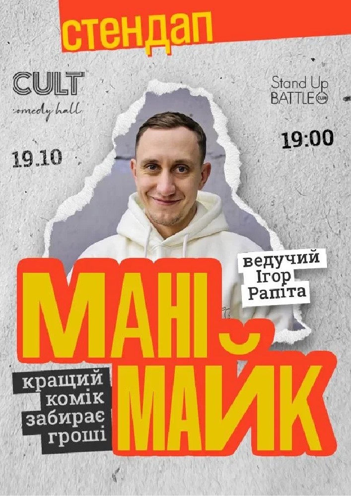 Запрошуємо вас на наш вже традиційний недільний Манімайк – подія, на якій коміки боротимуться за приз та звання «коміка тижня», тому очікуйте тільки найкращі жарти та історії! Прийдіть підтримати свого фаворита, адже саме ви, глядачі, вирішуєте, хто заслуговує на перемогу.