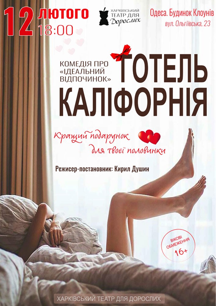 Подаруйте собі та своїм близьким вечір в шикарному номері готелю Каліфорнія та зустріч з неперевершеним ХАРКІВСЬКИМ ТЕАТРОМ ДЛЯ ДОРОСЛИХ!