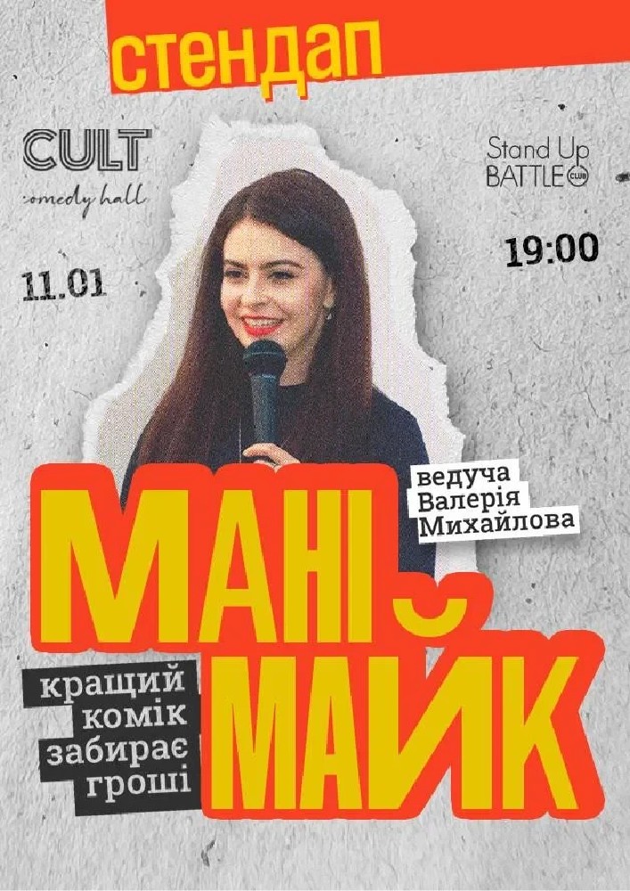МаніМайк — це вечір живого стендапу, де коміки виходять до вас з новими жартами, та змагаються за грошовий приз. Глядачі стають суддями шоу, вибираючи, хто цього вечора буде найсмішнішим