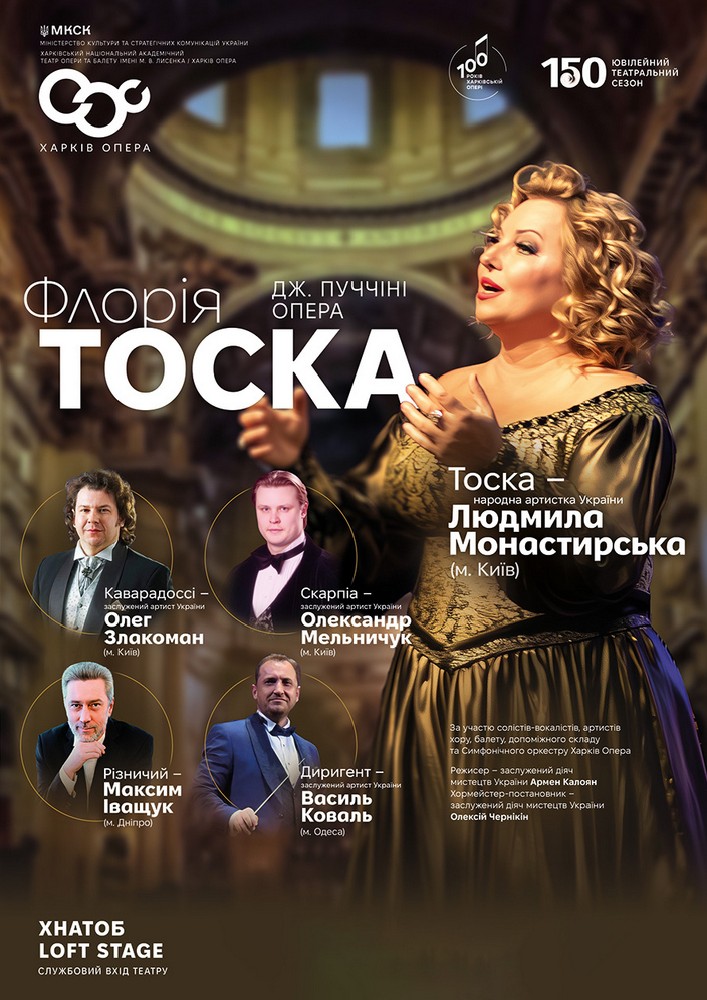 Харківський академічний театр опери та балету імені М. В. Лисенка запрошує вас на неординарну постановку музичної драми Джакомо Пуччіні «Флорія Тоска»! Ця вистава має особливу історію для нашого театру: її було представлено харків’янам ще 1993 року на сцені «старого» театру на вулиці Римарській, і саме тоді вона стала першою постановкою опери італійською мовою в історії нашого колективу. Нова постановка 2017 року вже здобула міжнародне визнання після тріумфальних показів на фестивалях у Бельгії та Нідерландах. Головна героїня – оперна примадонна Флорія Тоска – горда, пристрасна, норовлива, несамовита в любові, ревнощах і помсті. Поринайте в атмосферу Риму початку ХІХ століття з її разючими контрастами: пристрасні любовні зізнання та побожні молитви, безтурботна пастораль та драматичні колізії. Не пропустіть нагоду стати свідками трагічної історії кохання та смерті, затамувавши подих від сили музики Джакомо Пуччіні! Тим більше, що на вас чекає зустріч з неординарними виконавцями…