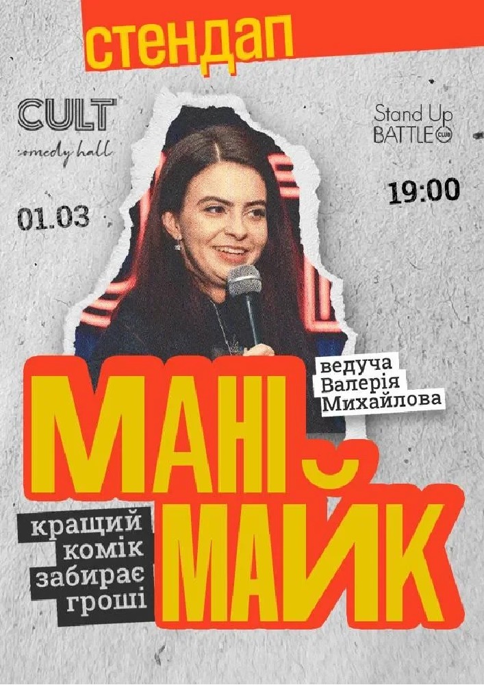 Недільний МАНІМАЙК вечір, де коміки виходять на сцену, щобзарядити зал сміхом і поборотися за звання «коміка тижня»!