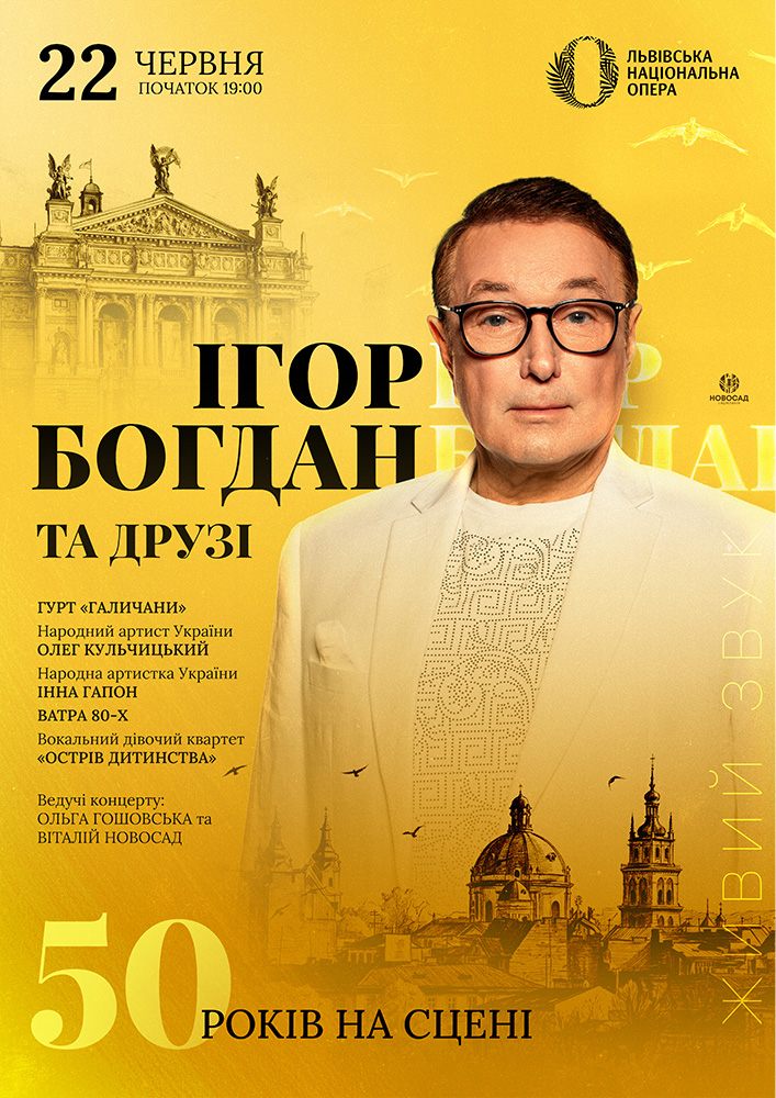 50 років на сцені Заслужений артист України, легендарний голос Львова та улюбленець українських громад усього світу — Ігор Богдан — запрошує вас відсвяткувати знакову віху: «50 років на сцені» у колі найкращих друзів.