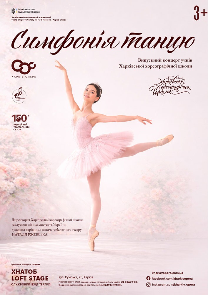 Станьте свідками феєрії танцю на випускному вечорі Харківської хореографічної школи! Цьогоріч учні школи разом з артистами балету Харків Опера представлять захоплюючу танцювальну програму. Це не просто концерт, а справжнє свято грації, таланту та молодості, де кожен рух сповнений натхнення та майстерності. На вас чекає феєричне дійство, що об’єднає класичні традиції та сучасні хореографічні тенденції. В програмі – фрагменти з класичних балетів «Дон Кіхот» та «Баядерка» Л. Мінкуса, «Шопеніана» за творами Ф. Шопена, «Копелія» Л. Деліба у виконанні артистів балету Харківського національного академічного театру опери та балету ім. М. В. Лисенка, а також номери, що підготували учні 4-9 класів Харківської хореографічної школи.