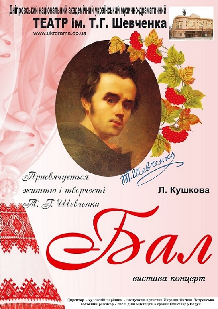 Головною постаттю у виставі є молодий Тарас Шевченко – випускник Петербурзької академії мистецтв, який поступово набував слави художника, уже написав певну кількість своїх віршів-шедеврів, закохувався у жінок, мав акторські здібності. Жанр нашого дійства оригінальний – вистава-концерт. На балу у князя Рєпніна звучать поезія Кобзаря та пісні на його вірші у виконанні як дворян, так і служниць та кріпаків. Ну, а який же бал без танців? Артисти драми та балету у вишуканому вбранні під чарівну музику у виконанні живого оркестру переносять глядача у далекі 40-і роки ХІХ століття. Персонажі у виставі-концерті як історичні, так і вигадані.